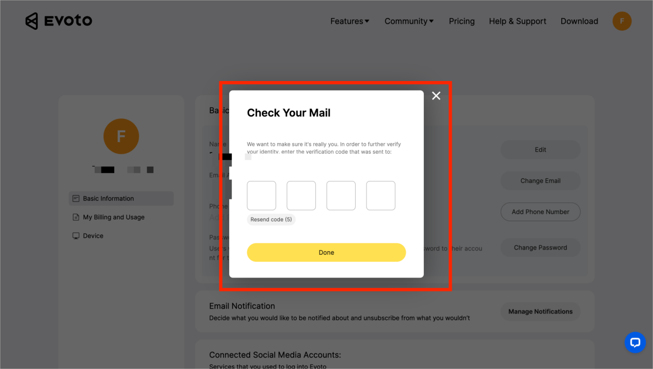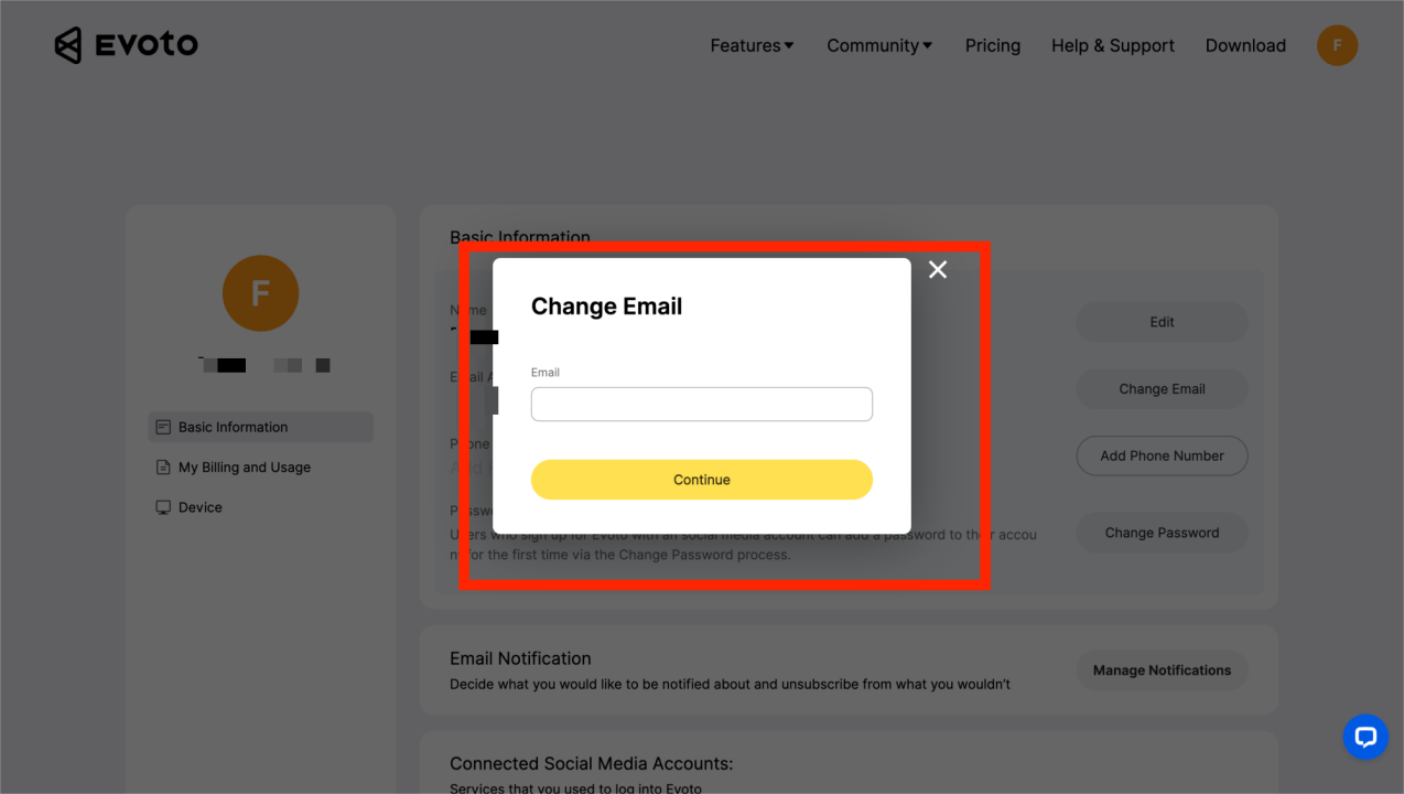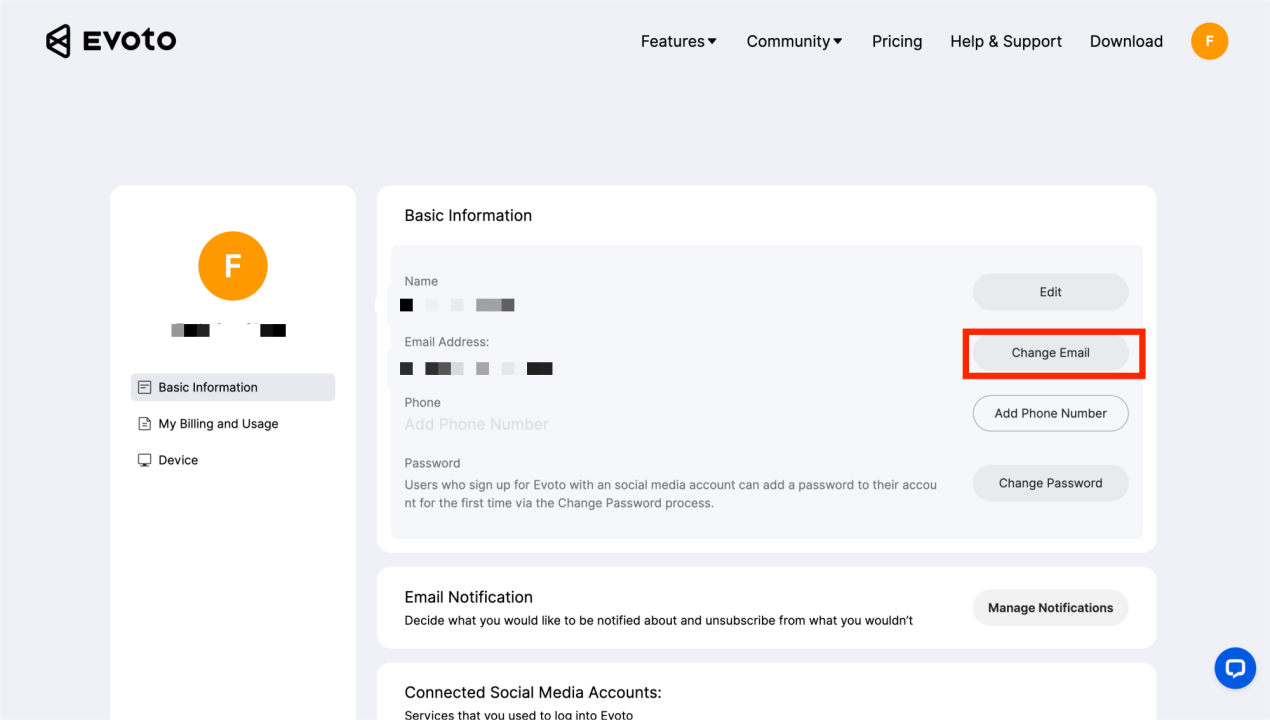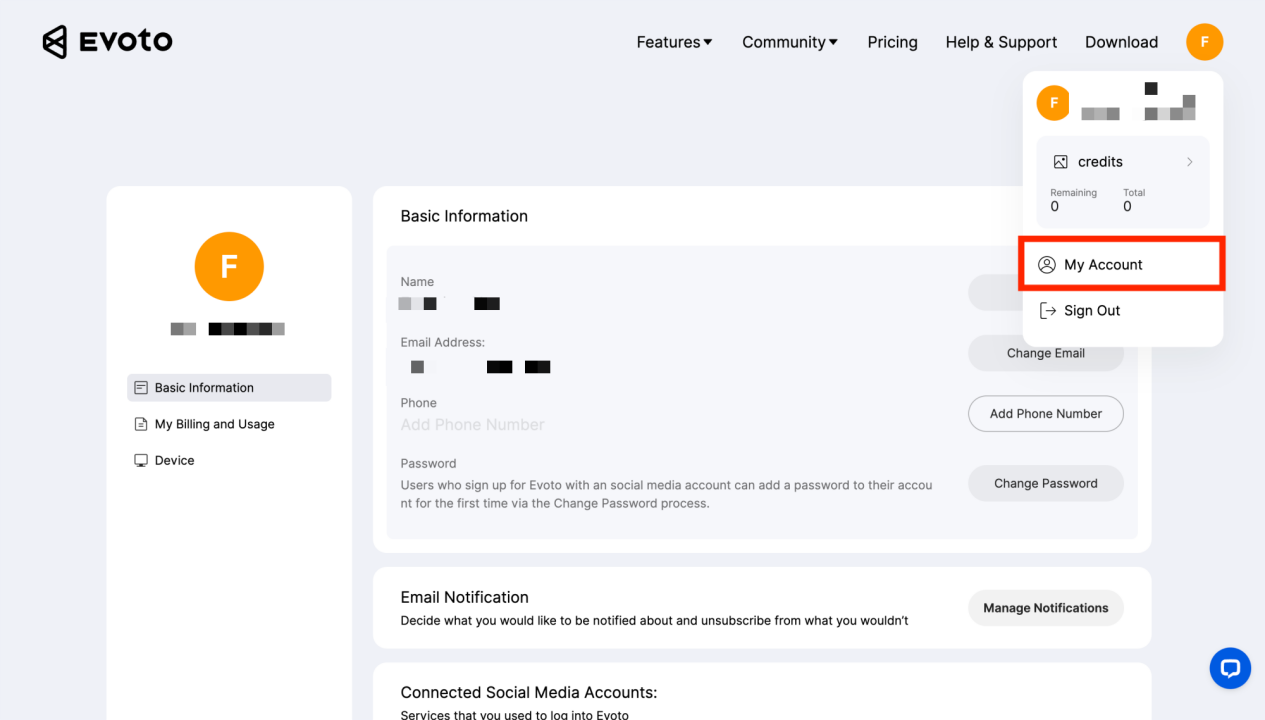 Obecnie Evoto umożliwia zmianę adresu e-mail na oficjalnej stronie internetowej, jeśli użytkownik nie zakupił kredytów. Przenoszony adres e-mail nie może być wcześniej zarejestrowany. Jeśli przenoszony adres e-mail został już zarejestrowany, należy najpierw usunąć to konto, a następnie zmienić adres e-mail. Poniżej znajdują się instrukcje: