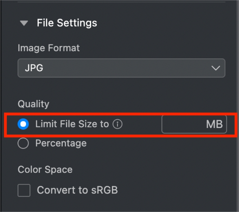 You can set a specific file size for the exported images. But note that if the file does not meet the limit, it will be as close to that value as possible.
