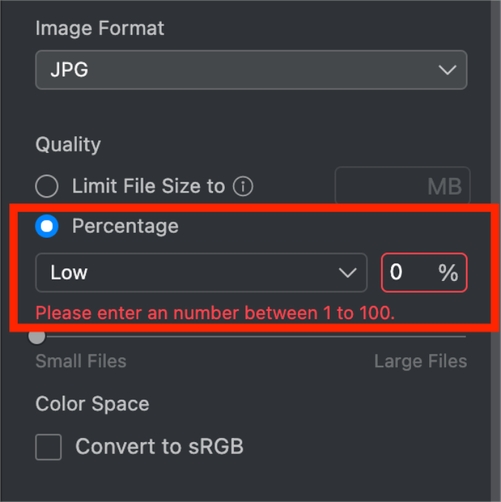 You can enter a specific number between 1 to 100 to set the Quality Percentage. But note that if you enter a minuscule value, such as 1%, the images will still be exported at a secure percentage to ensure the quality of exported images.